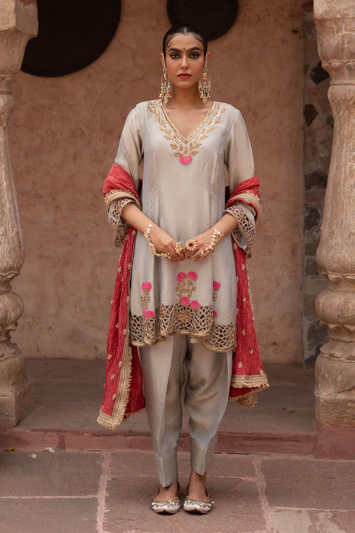 View full detailsA timeless classic reimagined — this short anarkali in soft grey tissue radiates quiet luxury with every detail. Intricately hand-embroidered with ...