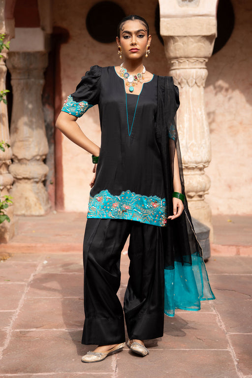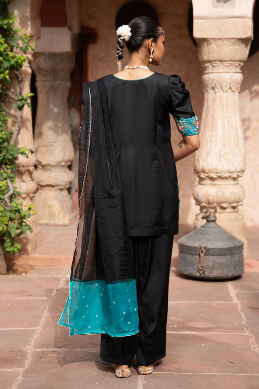 View full detailsGraceful and striking, this Midnight Noir ensemble is crafted from imported satin, radiating refined elegance. The kurta features exquisite hand em...