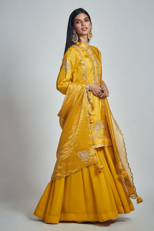 View full detailsRadiant and refined, this light golden sharara set is a vision of understated opulence. Crafted in tissue fabric with a soft golden tilt, the ensem...