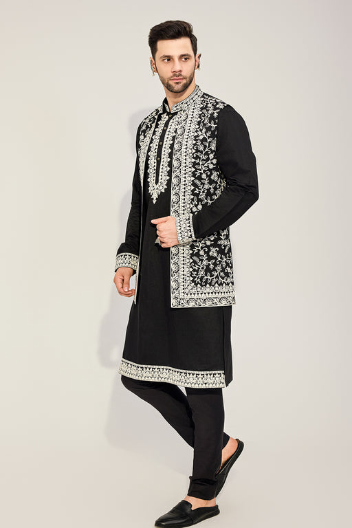 Black Kurta Jacket Set With White Embriodired Fabric: Silk Blend Fit: Comfort No. of components: 3 Wash Care: Dryclean Delivery Time: 10 Days