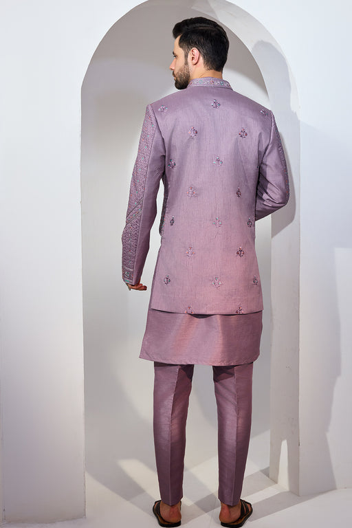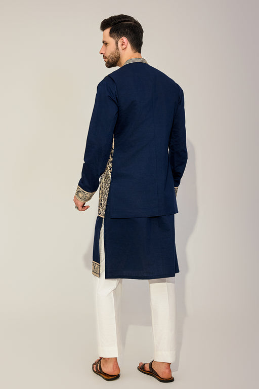 Navy Kurta Jacket Set With Beige Embriodry Fabric: Silk Blend Fit: Comfort No. of components: 3 Wash Care: Dryclean Delivery Time: 10 Days