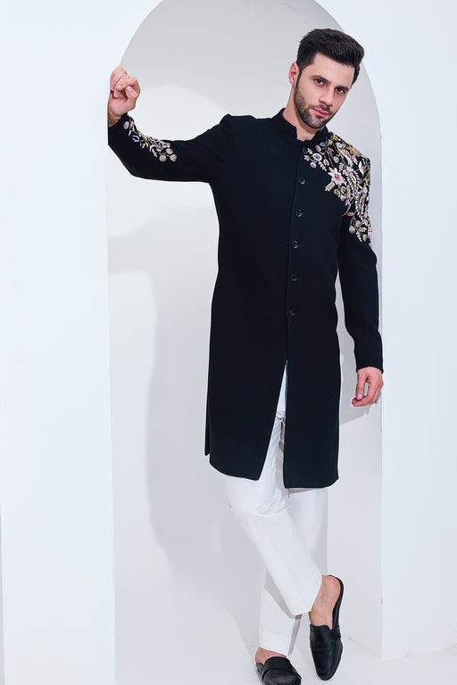 Black Texture Achkan With Chest And Sleeve Embriodry Fabric: Viscose Blend Fit: Comfort No. of components: 2 Wash Care: Dryclean Delivery Time: 15 ...