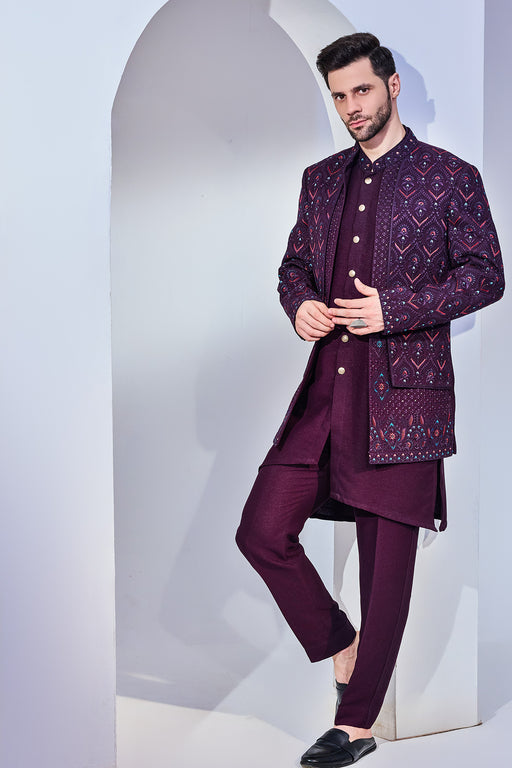 View full detailsWine Indo With Kurta And Pant Fabric: Silk Blend Fit: Comfort No. of components: 3 Wash Care: Dryclean Delivery Time: 10 Days