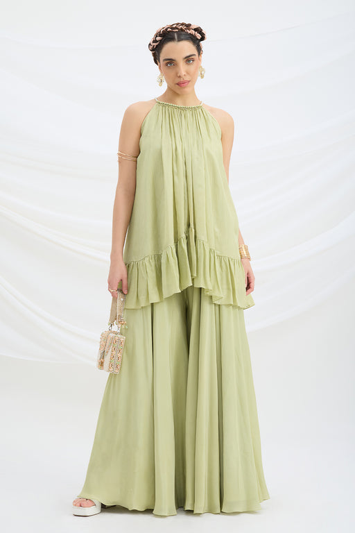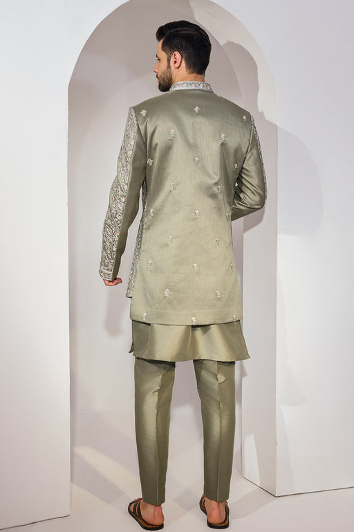 View full detailsRadiating old-world charm with a modern soul, this green tissue ensemble is infused with a soft golden tint that catches the light beautifully. The...