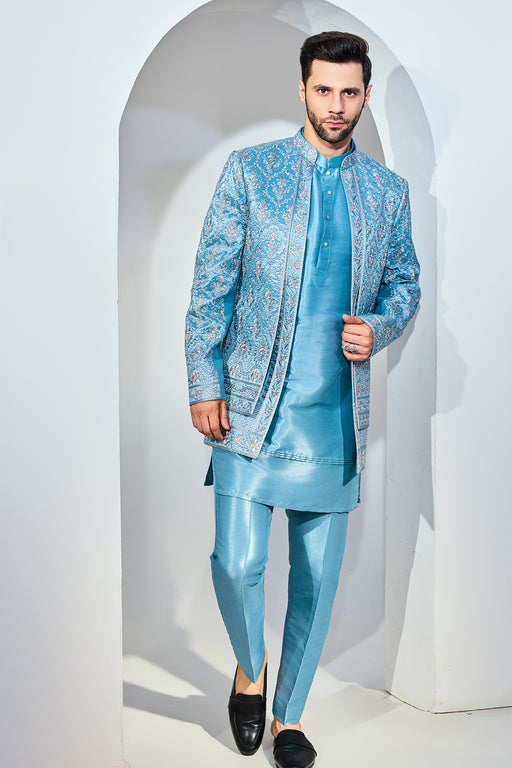 Light Blue Indo With Kurta And Pant Fabric: Silk Blend Fit: Comfort No. of components: 3 Wash Care: Dryclean Delivery Time: 10 Days