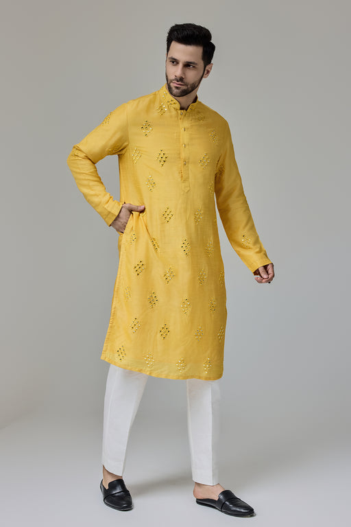 Yellow Mirror Kurta Fabric: Silk Blend Fit: Comfort No. of components: 2 Wash Care: Dryclean Delivery Time: 12 Days