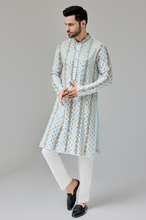 Light Blue Leather Patch Mirror Kurta With Zari Fabric: Silk Blend Fit: Comfort No. of components: 2 Wash Care: Dryclean Delivery Time: 12 Days