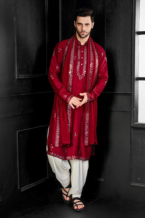 Red Mirror Kurta With Salwar And Dupatta Fabric: Silk Blend Fit: Comfort No. of components: 3 Wash Care: Dryclean Delivery Time: 10 Days