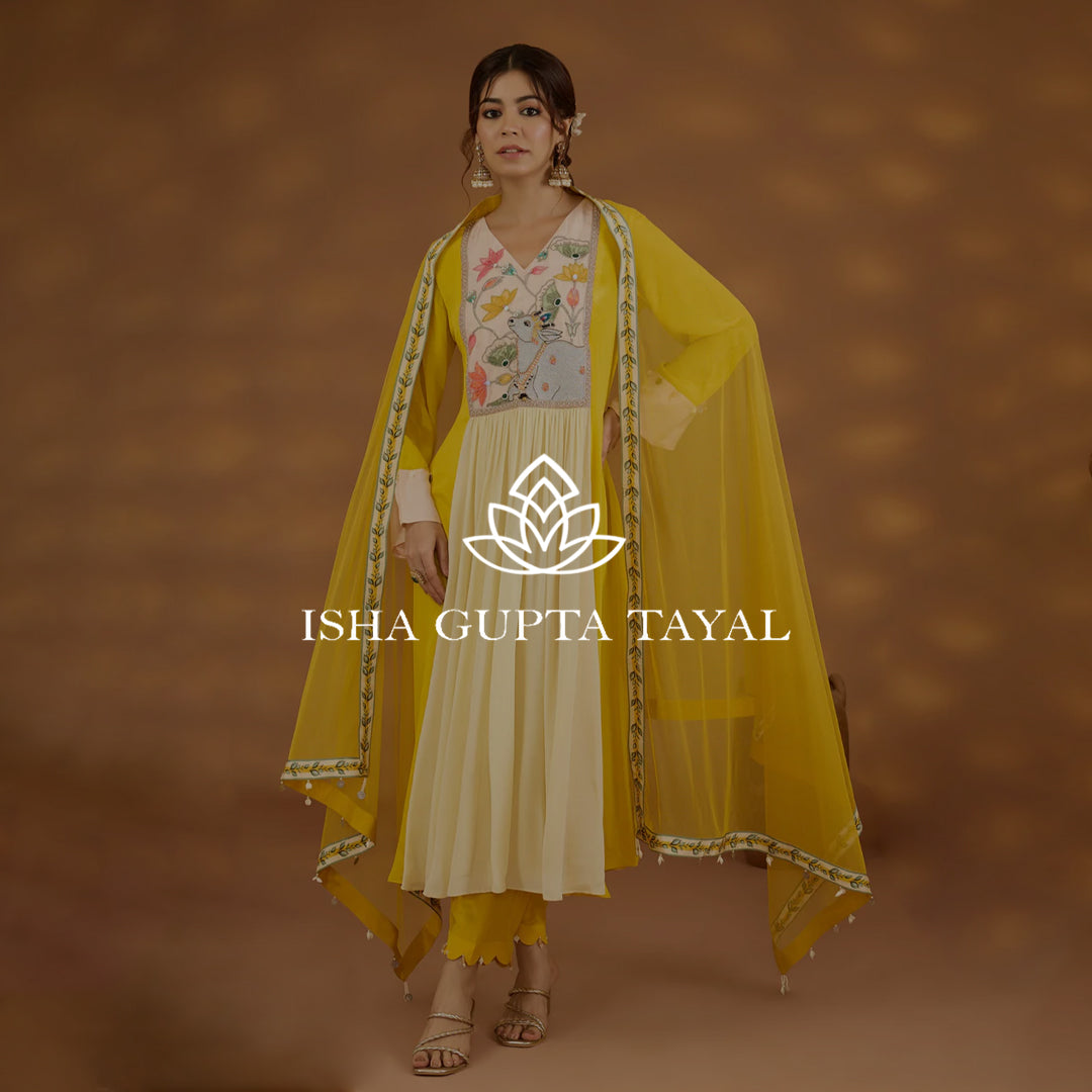 View full detailsEthereal and sophisticated, this long A-line kurta set in light golden tissue fabric is a true celebration of traditional artistry. The kurta featu...