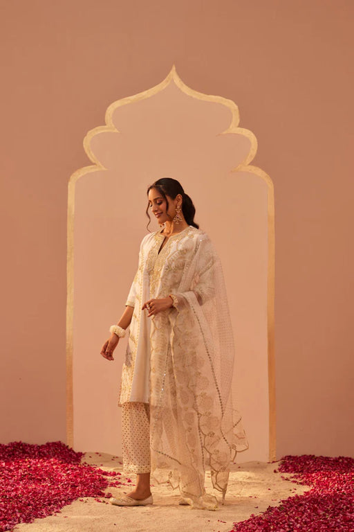 View full detailsEthereal and elegant, this off white kurta set features intricate hand embroidery in zari and resham on the kurta, adding a luxurious texture and s...