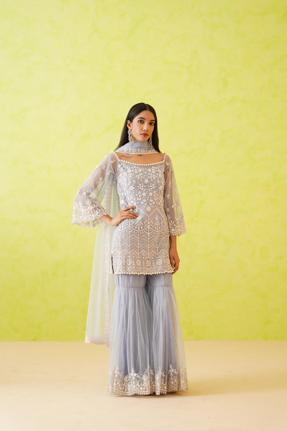 If elegance had a colour, it would be this powder blue. This Garara set features a net kurti with meticulous pearl and thread embroidery that whispers luxury. The matching garara and net dupatta complete the look, making it perfect for pre-wedding events, family gatherings, or even intimate celebrations where you want to look graceful and polished.