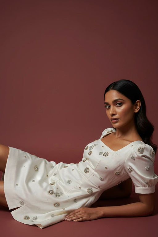 View full detailsMonet dress features delicate hand-embroidered floral motifs. The structured bodice and soft V-neckline balance the craftsmanship, while the puffed...