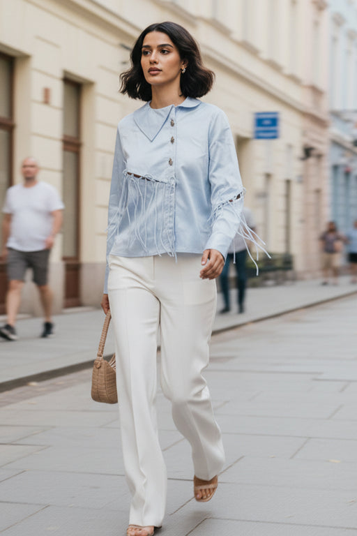 This light blue shirt features a distinctive elongated collar and a clean button-down front, elevated with delicate thread detailing that cinches s...
