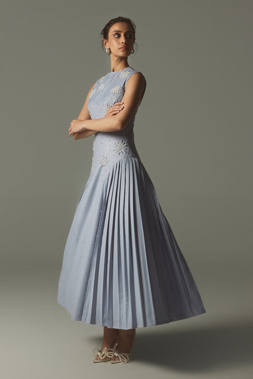 View full detailsA periwinkle blue sleeveless gown with delicate pearl and floral embellishments, featuring a beautifully cinched waist that flatters the silhouette...
