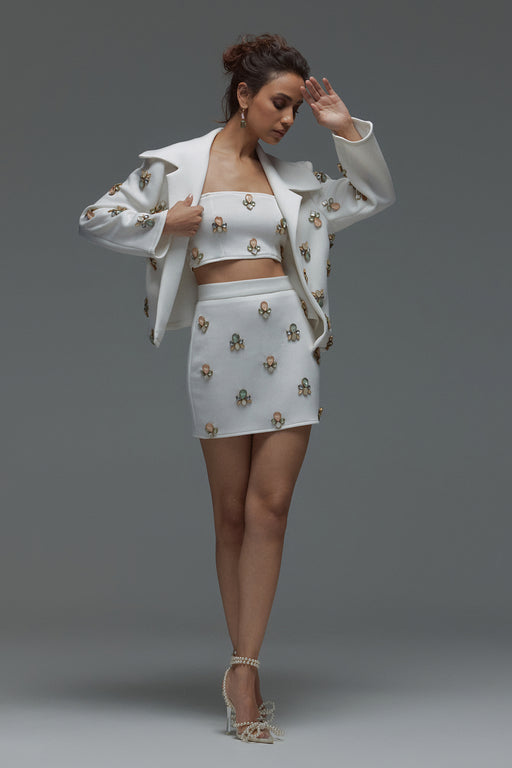 View full detailsA chic three-piece set featuring a structured jacket, crop top, and mini skirt, embellished with floral crystal motifs for a bold yet feminine stat...