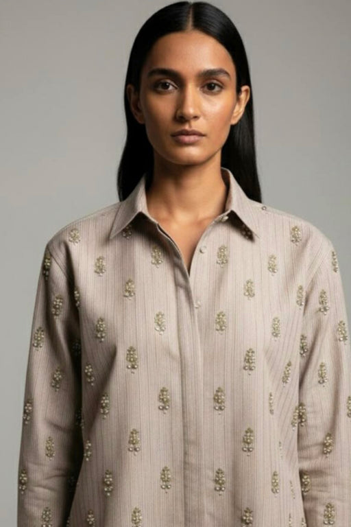 View full detailsThis soft beige shirt is crafted in a structured yet fluid silhouette, featuring delicate all-over embellishments that add a refined, tactile dimen...