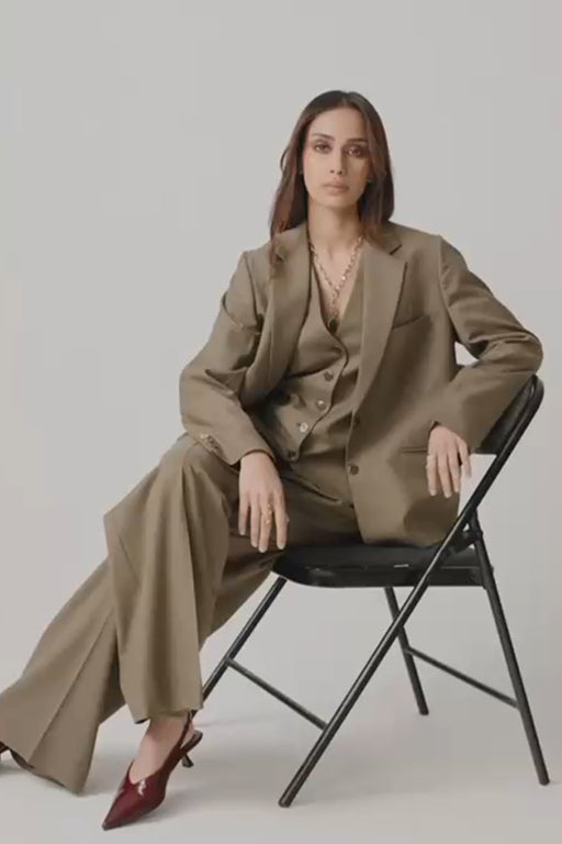 View full detailsThe Naomi Set features a sculpted vest with a back drape, a flared pleated skirt, and a cropped blazer, blending structure and movement for a refin...