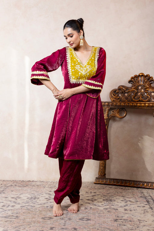 View full detailsRooted in tradition with a contemporary twist — this wine choga set features intricate embroidery that adds richness to its relaxed silhouette. A t...