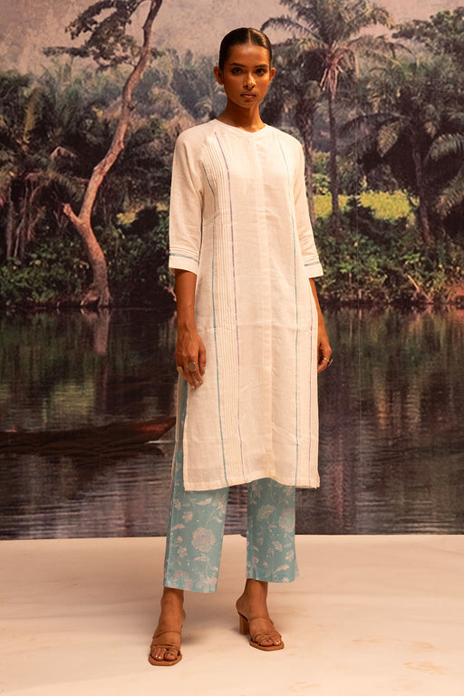 View full detailsCreative use of lavender & blue waste fabric from our previous collections, by placing it across pleatings on Kaarimiori weaved Linen Kurta. 10...