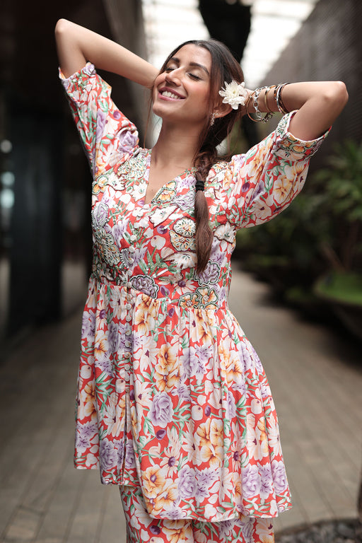 View full detailsThis beautiful cotton print Co-ord set is a charming combination of playful elegance, delicate style and comfort. The beautiful red floral print ma...