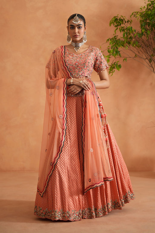 View full detailsDeepika Chadha's stunning coral dupion silk fabric blouse beautifully adorned with intricate thread, dabka,seuins,cutdana embroidery. The flowy Ban...