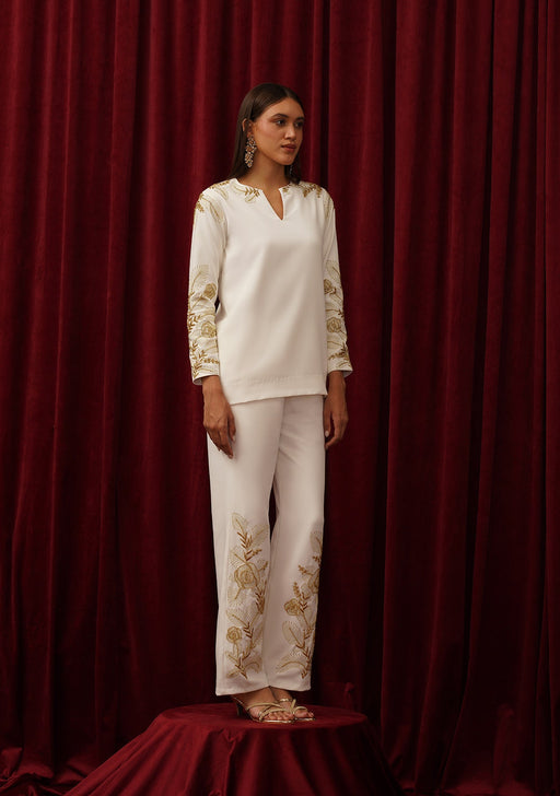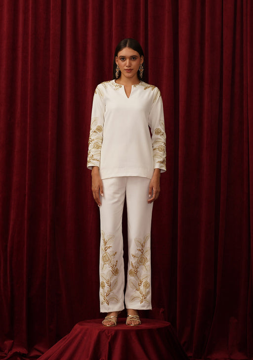 View full detailsDesigner NotesHand embroidered zari and cutdana embroidery detailPullover topTrouser with elasticated waistbandFully lined Relaxed fitFit, Fabric, ...