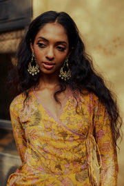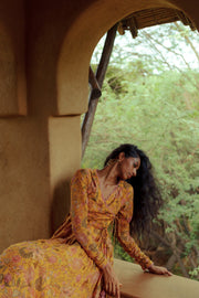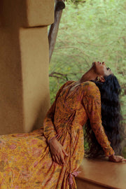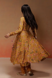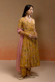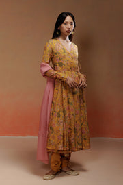 This set features a mango-colored printed anarkali with a graceful floral print. Hand touches on the yoke highlight the motifs, while multiple tassels crafted from stones and embroidered fabric add a charming detail. It is paired with a churidar and a contrasting pink organza dupatta finished with a scalloped border.