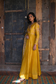 - Yellow multi colored thread embroidered micro pleated Anarkali