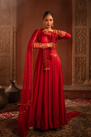 - Gota Filled Chooridaar Sleeves, Illusion Neckline With Pure Organza Adorns This Premium Chanderi Anarkali With An Interesting Jacqard Facing Paired With Chooridaar Bottom And A Pure Organza Dupatta With Ghunghroo All Over Border And A Big Motif Of Lotus With Hand Work In Centre.