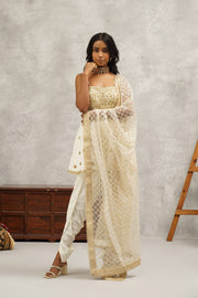 Kapda Dori's stunning white sheesha crape dhoti. The ivory color adds a touch of glamour and sophistication to your look, while the fabric ensures you feel comfortable all day or night long. It is styled with ivory sheesha crape peplum anarkali beautifully adorned in zari, sequins and stones work. Pair it with complimenting net sequins dupatta.