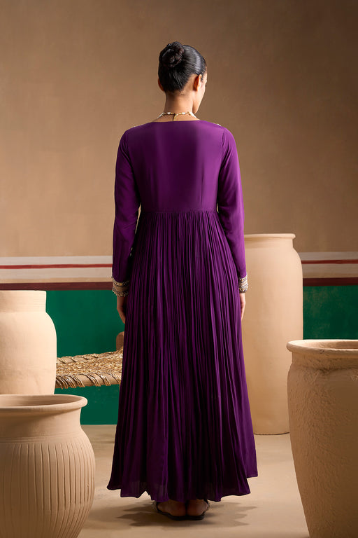Featuring a purple mirror work with gold zari anarkali paired with churidaar in mulmul comes with organza silk dupatta. No. Of Pcs: Anarkali/Chur...