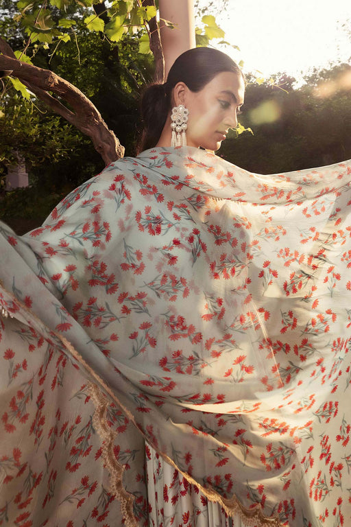 White floral printed Anarkali in georgette fabric with embroidered neckline and silk organza dupatta with sequin embroidery an...