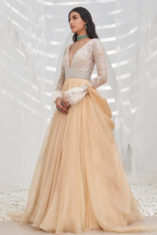 View full detailsThe long ankle length kalidaar anarkali is made in pure silk chanderi fabric teamed up with a chooridaar and a silk organza dupatta. The outfit is ...