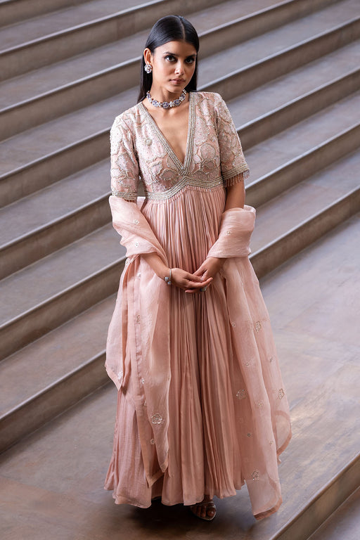 Featuring a pink Chanderi Anarkali paired with cotton silk churidar and organza base dupatta with gold dori and aari embroidery on it.