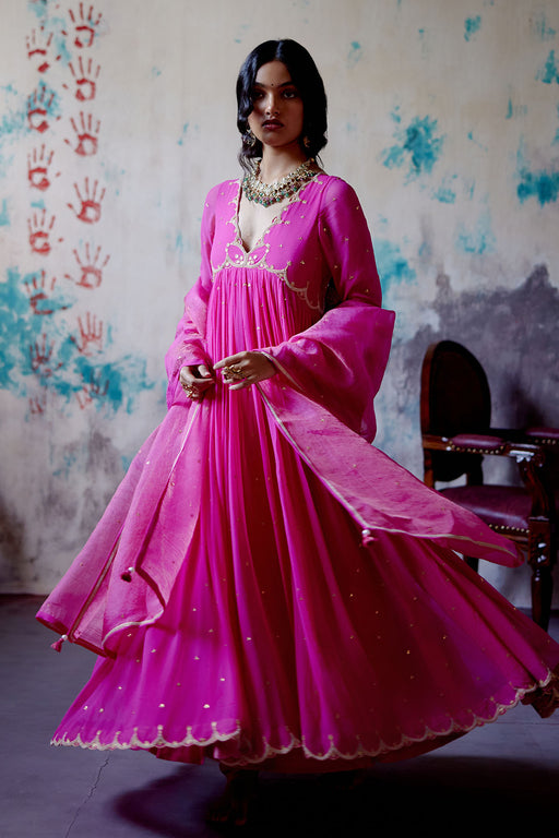 Handemroidered anarkali crafted from pure crepe, paired with a net dupatta. The anarkali is in a vibrant magenta pink color and features intricate ...