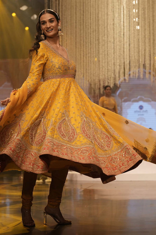 This anarkali comes with butter crepe lining and is fully hand embroidered