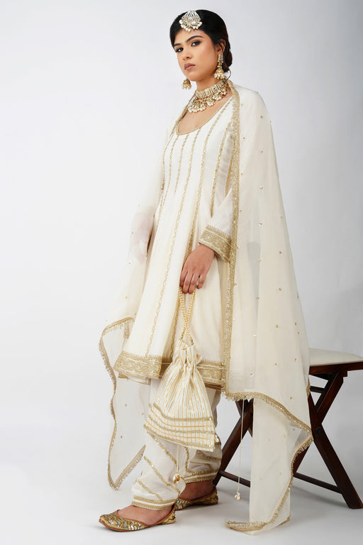 View full detailsIntroducing our White Beige jacquard cotton Anarkali Suit set, exquisitely crafted with intricate golden embroidery. This elegant piece features a ...