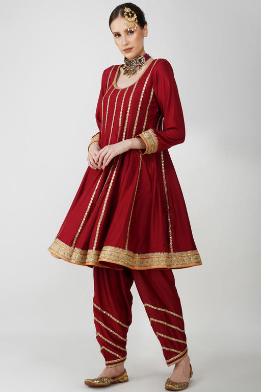 View full detailsStep into royalty with our mahroon cotton Silk Anarkali adorned with exquisite golden embroidery. This elegant ensemble features a anarkali short w...