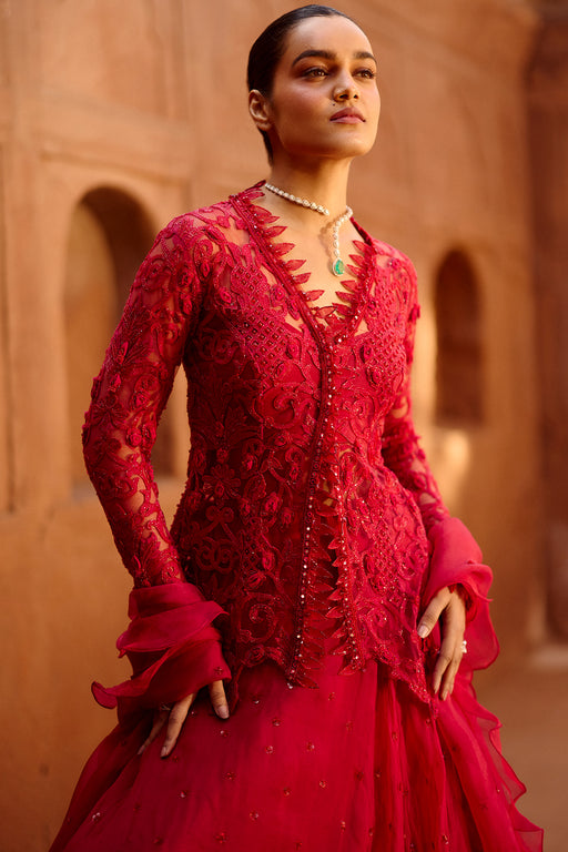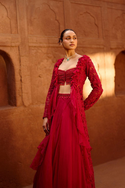 A vibrant crimson red lehenga adorned with intricate floral embroidery, accompanied by a beautifully embroidered blouse and a luxuriously crafted c...