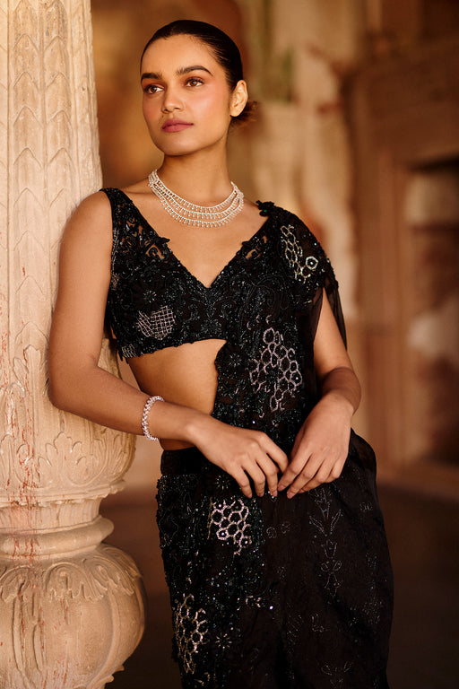 A sophisticated black saree accompanied by a chic, sleek blouse and enhanced with fully embroidered sharara pants. The saree drape completes the en...