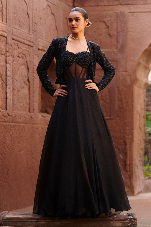 A captivating black corset gown adorned with intricate embellishments, accompanied by a short jacket boasting stunning embroidery and meticulous cr...