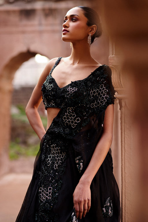 A stunning black Lehenga featuring an asymmetric drape adorned with intricate embroidery details, elegantly paired with a fully embellished blouse.