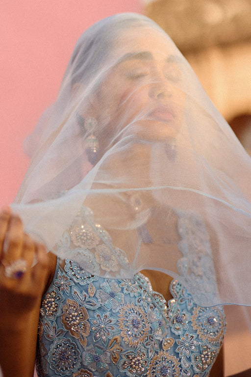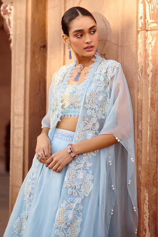 Powder Blue Lehenga, intricately adorned with ethereal pastel floral embroidery - complemented by an embroidered blouse and a cascading cape, evoki...