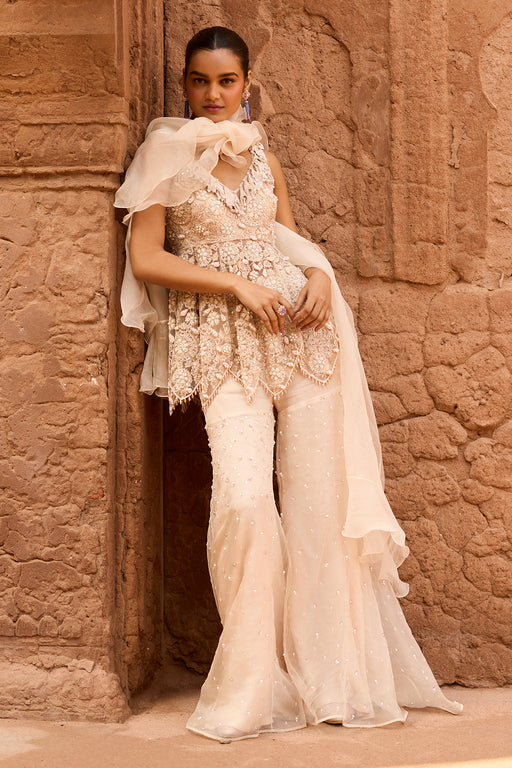 An exquisite ivory peplum ensemble, featuring a fully embellished peplum top paired with flared pants. Completed with a ruffle-edged dupatta, this ...