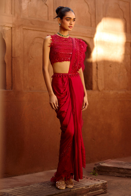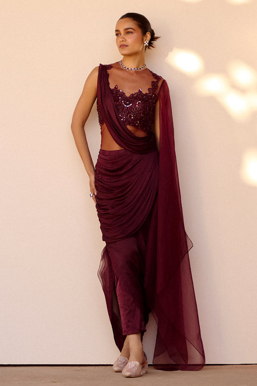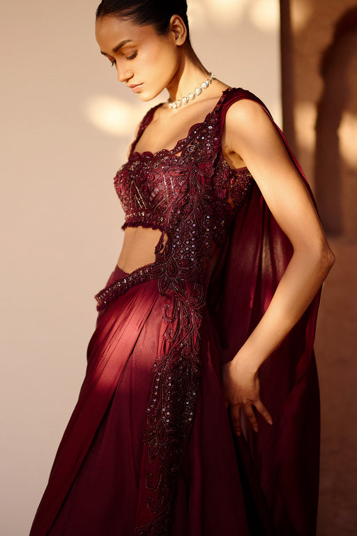 A captivating deep Sangria/Wine ensemble, presented as a draped saree one-piece, adorned with an embellished blouse seamlessly cascading into grace...