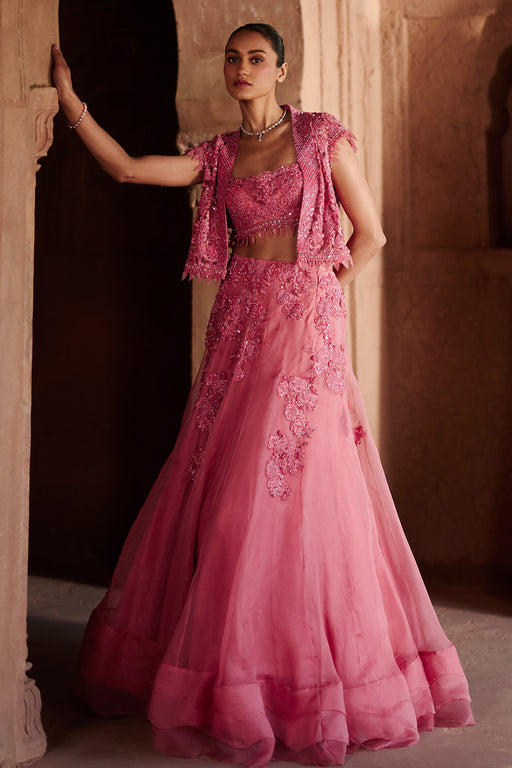 An enchanting Brink Pink Lehenga featuring asymmetric linear floral embroidery gracing the skirt, accompanied by a fully embroidered blouse. The en...