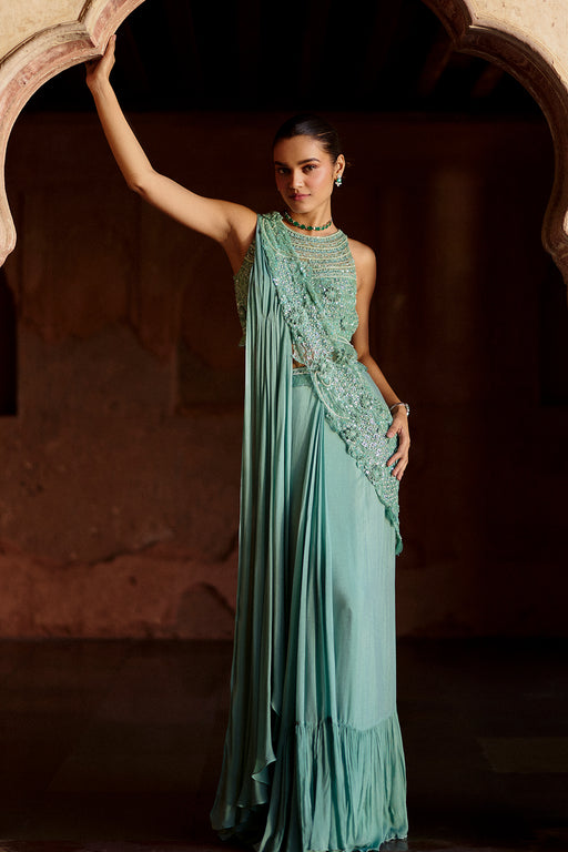 A stunning frosty mint draped saree paired with a fully embroidered halter blouse and an intricately embroidered waist. The ens...