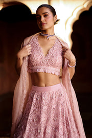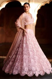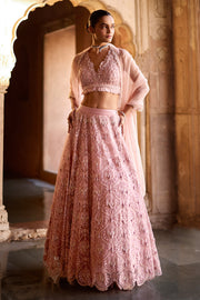 Adorn yourself in the timeless elegance of our rose pink embroidered lehenga, boasting a fully embellished blouse and skirt, perfectly complemented by a subtly highlighted dupatta.