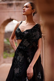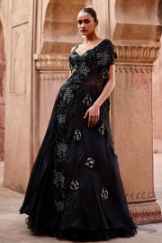 A stunning black Lehenga featuring an asymmetric drape adorned with intricate embroidery details, elegantly paired with a fully embellished blouse.
