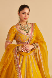Crafted in pure raw silk, this exquisite lehenga features intricate Kashmiri Tilla and Gota Patti embroidery, beautifully highlighted with delicate pearls. Paired with a silk organza dupatta and a deep sweetheart neckline blouse with elbow sleeves and a deep back, the ensemble is finished with elegant gota detailing for a regal touch.